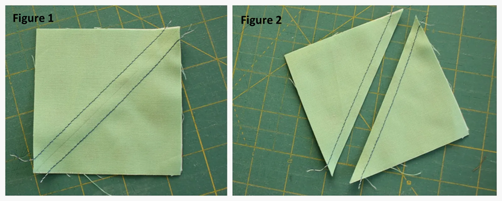 To make the 6 pinwheels, take your 2 ¼” squares of striped fabric (E) and draw a diagonal line on the back of them from corner to corner. With right sides together, pair them with the 2 ¼” squares of red drop fabric (F). Sew ¼” on both sides of the drawn diagonal line (see Figure 1). Cut along the drawn line, making two triangles (Figure 2). Open triangles and press seams toward the red drop fabric. Take a ruler with a 45-degree line and match that line up with the sewing line, now trim this piece to a 1 ½” square (we gave you extra fabric so you could trim for accuracy). The more accurately the seam lines up with the 45-degree line, the more precise your pinwheels will turn out. Repeat this for all 24 half square triangles.