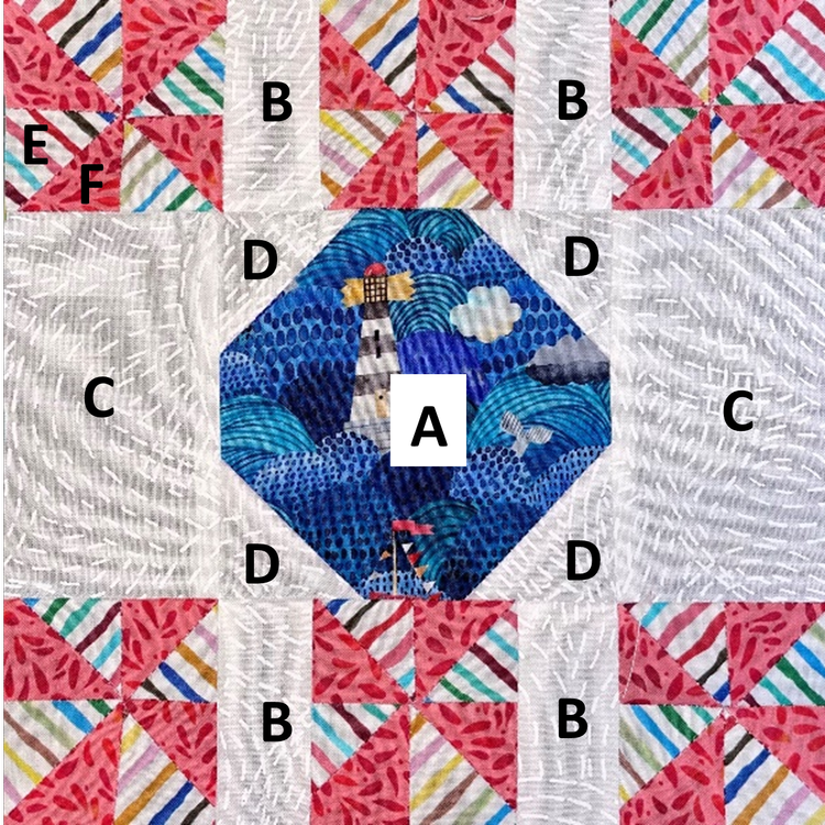 Take all four white 2” squares (D) and mark a diagonal line on the back of the square from corner to corner in pencil. This will be your sewing line. With right sides together, place the white (D) square on all four corners of the center sailboat square (A). The diagonal lines should be angled so that you create a hexagon. Stitch right on top of the diagonal line. Trim seam and press seam toward the white fabric. Repeat so that all four corners have been sewn and your final piece measures 4 ½” square.